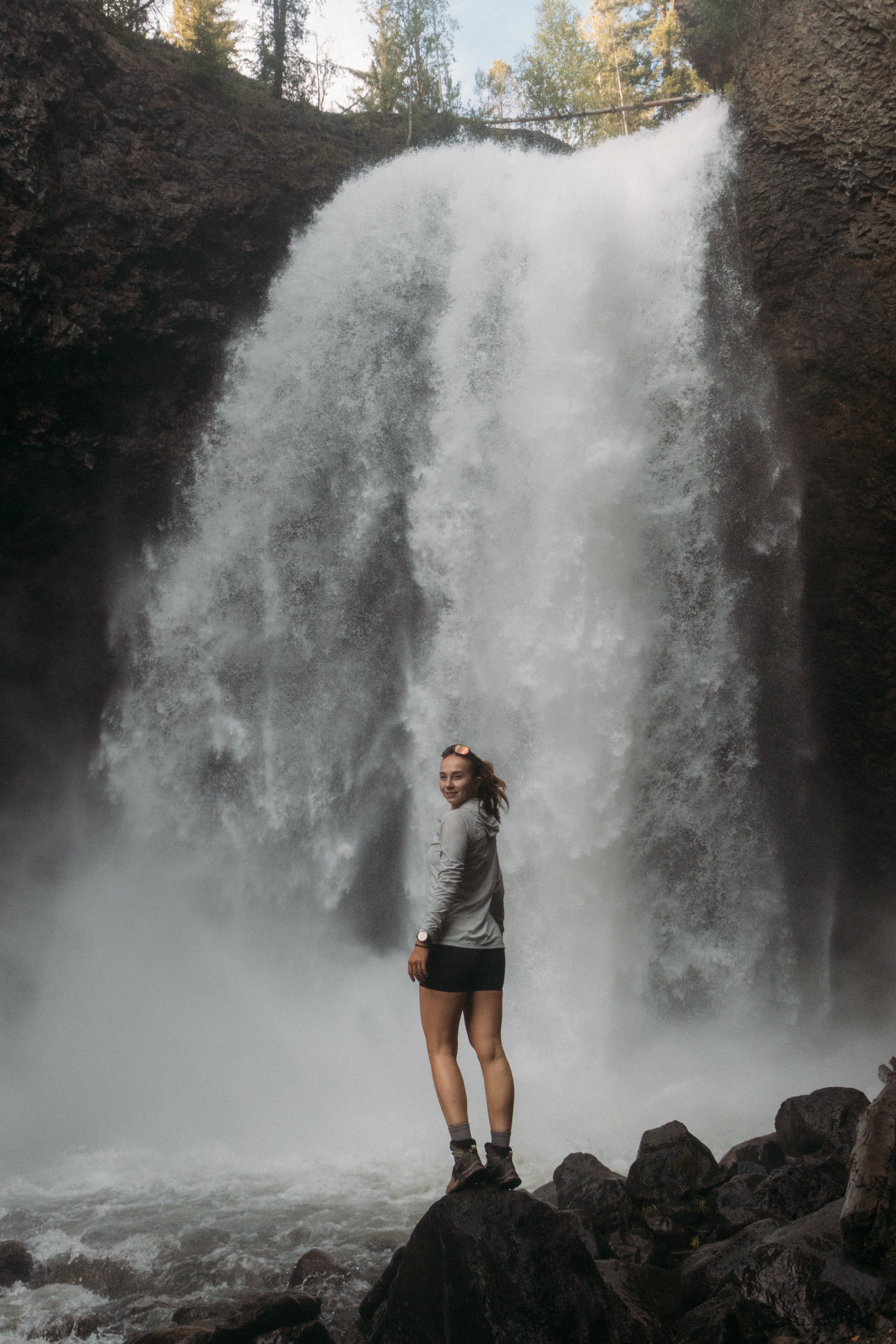 I love this hike so much! You can even go behind the waterfall on a slightly slippery flattened rock trail â watch your step and prepare to be sprayed! The trail is mostly uncovered, so expect lots of sun if you are hiking mid-day. Pack the sunscreen! There’s also plenty of black bear activity on this trail, so make sure youâre making noise and know how to behave in case of a bear encounter.