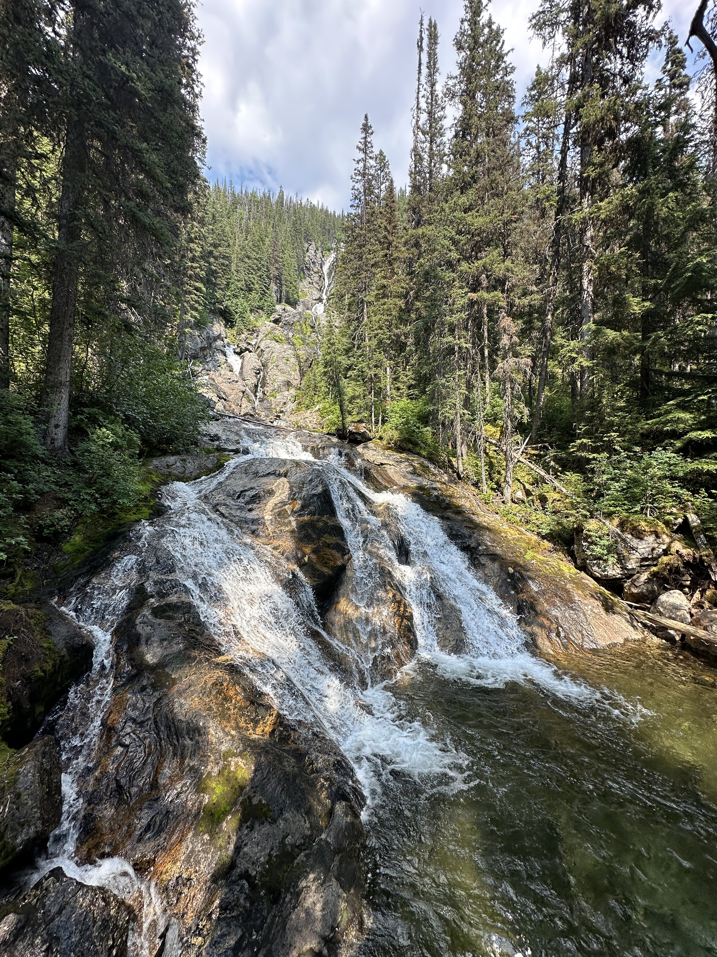 Although not technically in Wells Gray, Silvertip Falls is located up the same road as the Trophy Meadows trail. Turn right at the sign for Trophy Meadows and then right at the fork towards Silvertip Falls Recreation Site. The walk is only 2 kilometers and takes you up close and personal to a cascading waterfall much larger than Helmcken!